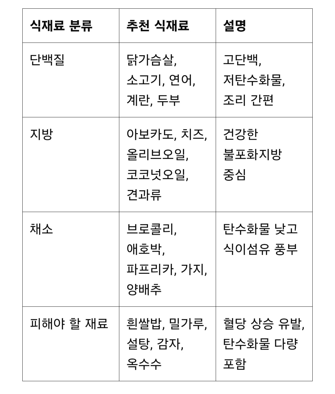 탄수화물을 줄이되, 몸에 좋은 지방과 단백질을 충분히 섭취함으로써 포만감은 오래가고, 칼로리는 자연스럽게 감소하게 됩니다. 게다가 연어, 닭가슴살, 두부, 치즈 등 익숙한 식재료로도 충분히 실현 가능해 누구나 쉽게 시작할 수 있는 식단입니다.