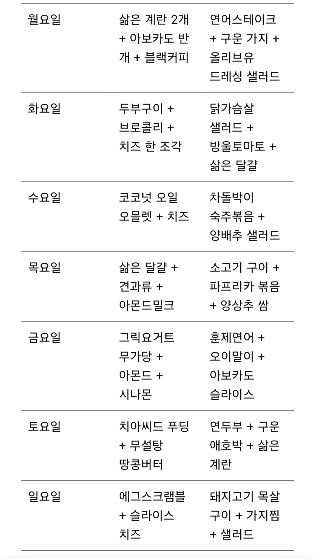 이처럼 요일별로 미리 구성해두면 장보기부터 조리까지 수월하게 진행할 수 있고, 갑작스런 외식이나 유혹을 피할 수 있는 체계적인 식단 관리가 가능합니다.