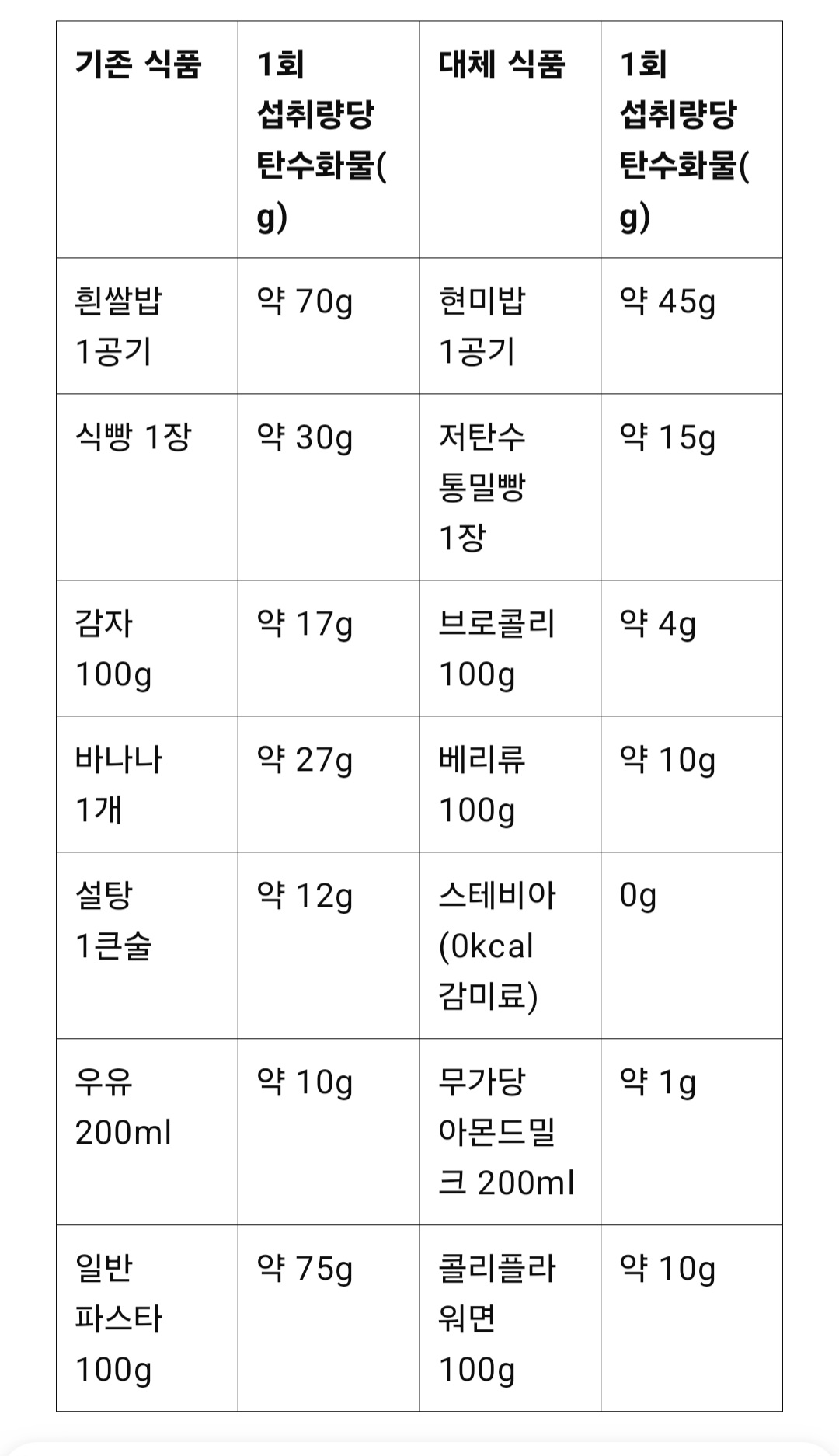 이 표를 통해 식품 선택 시 얼마나 많은 탄수화물을 섭취하는지 확인할 수 있으며, 탄수화물 줄이기를 위한 구체적인 실천 방법도 함께 고민해볼 수 있습니다.